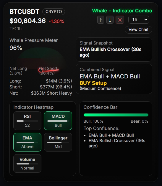 Bitcoin price analysis today shows a heavy imbalance between long and short positions as whales load up $362 million in net shorts, pushing BTC into a deeper consolidation below the $90,000 handle. While MACD has flashed a fresh bullish signal on both the 1-hour and 4-hour timeframes, the EMA trend remains firmly bearish β creating a rare, conflicting setup that often precedes a sudden volatility expansion.