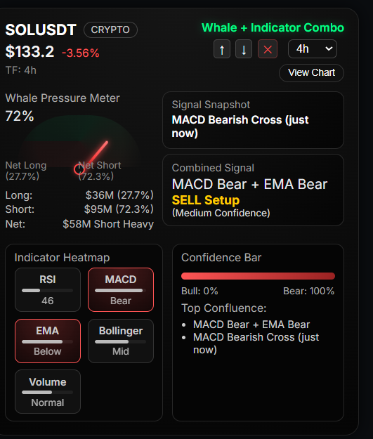With EMA Bear + MACD Bear aligning, SOL’s directional momentum favors downside.